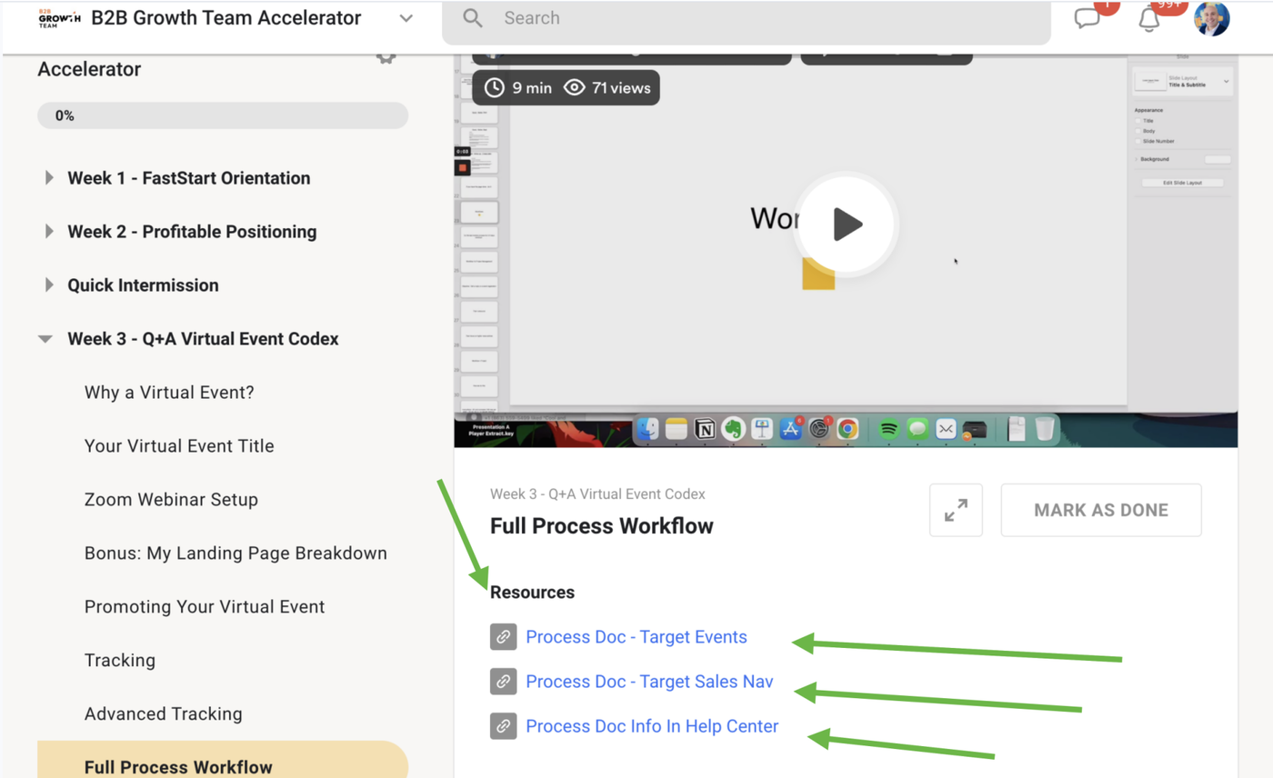 There are various processes interspersed around the program and they are located below the video training lessons. They will always be labeled 'Process Doc.