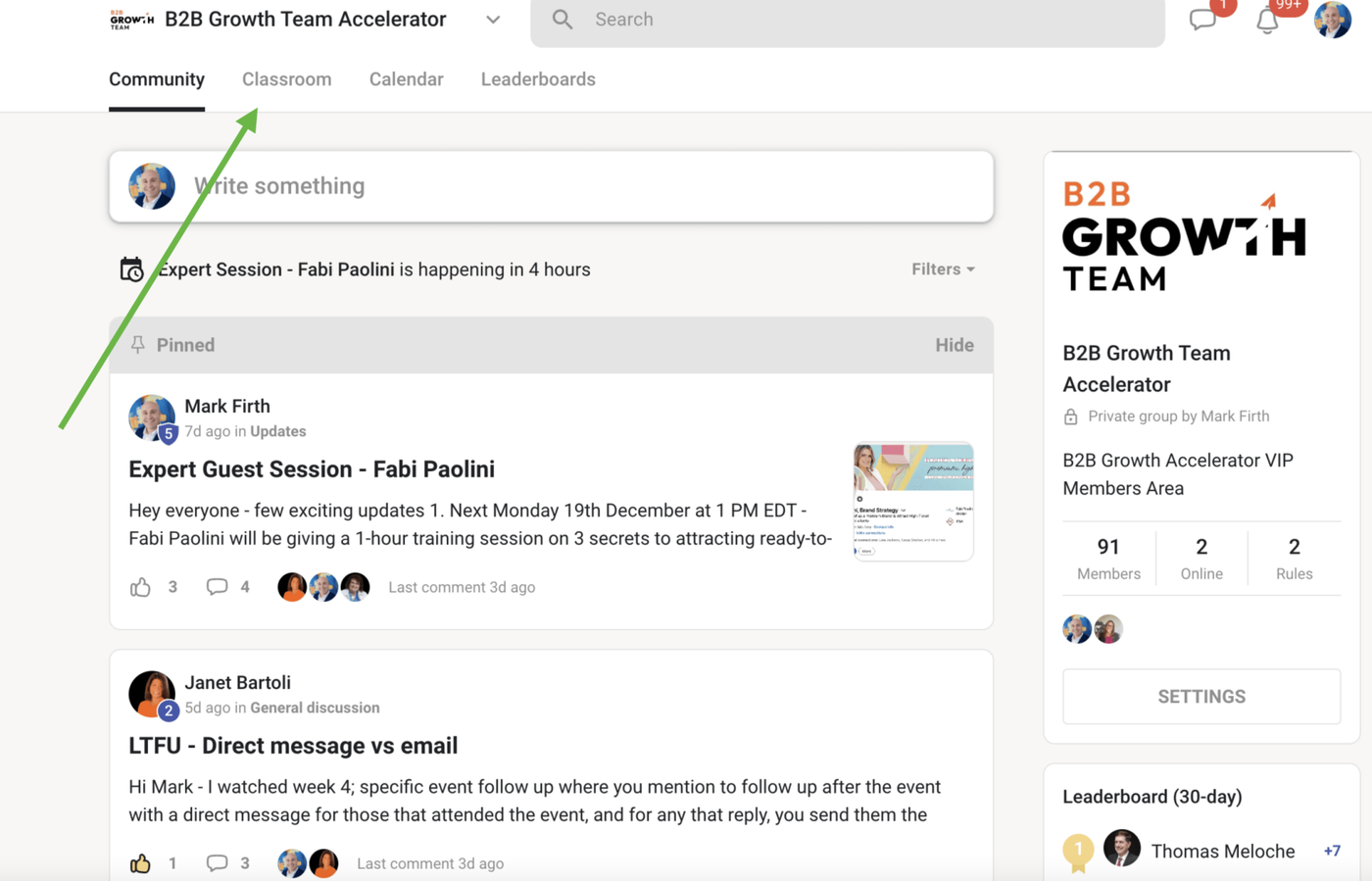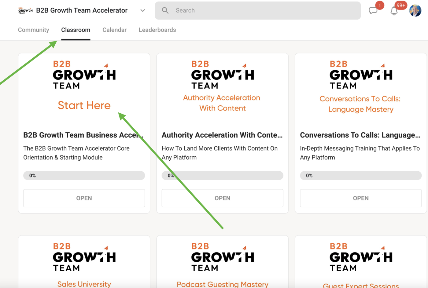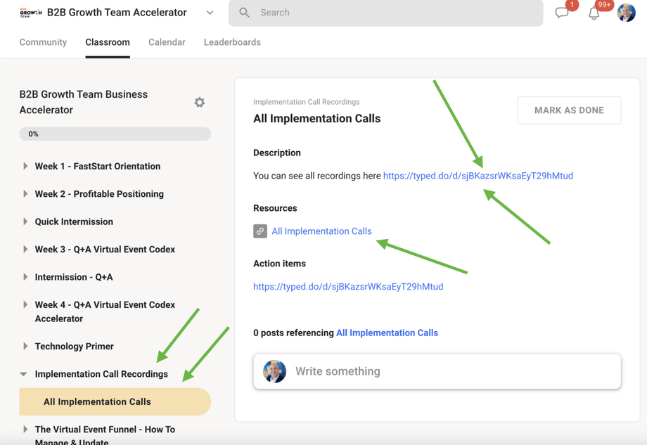To locate the implementation call recordings, please follow the steps below. Please note, they will be available 24 hours after the call takes place. Go to Classroom 2. Go to B2B Growth Team Accelerator 3. Locate the Implementation Calls Module